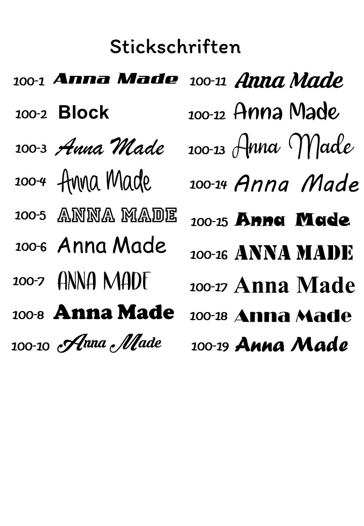 Sucht Euch eine Schrift und Garnfarbe aus der Übersicht aus und gibt diese mit dem gewünschten Schriftzug in der Personalisierung an. Soll ein Logo gestickt werden und eine Stickdatei nicht vorhanden sein, bitte den Artikel 50100 in der entsprechenden Größe einmalig mitbestellen. Erstellung der Stickdatei ist in diesem Fall nicht im Preis enthalten. Für weitere Bestellung ist dieses dann nicht mehr notwendig. Gegen Aufpreis wäre auch noch ein Kindemotiv möglich, dafür bitte den Artikel 50095 dazubestellen.